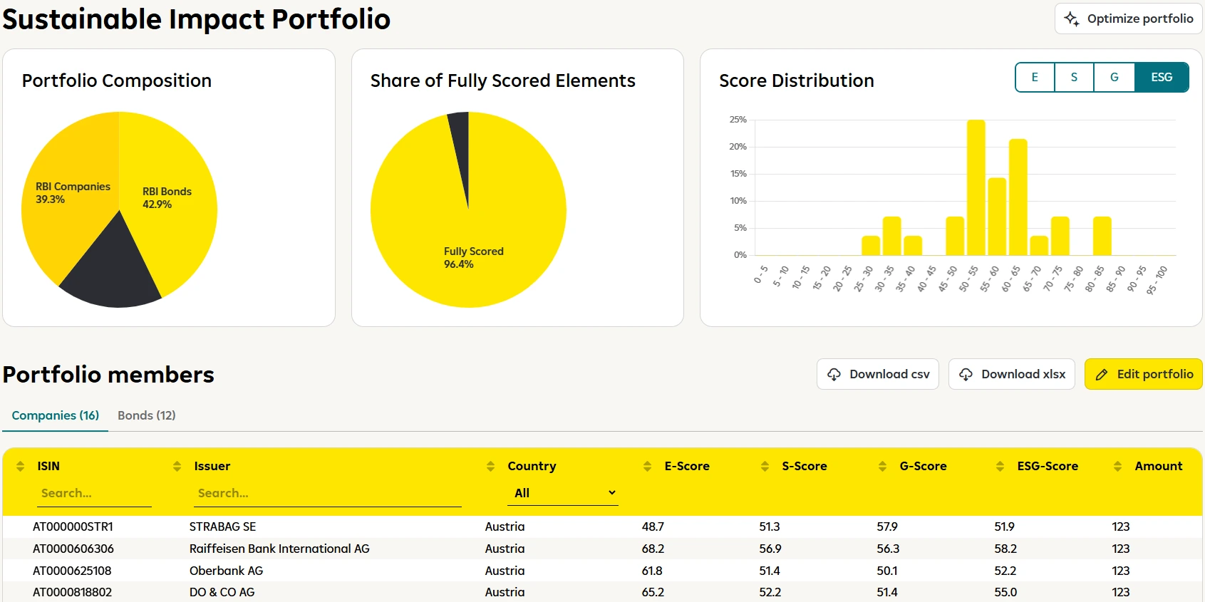 Upload your portfolio and instantly analyze ESG performance at asset level — by position, sector, or geography. Our optimization engine suggests how to improve ESG ratings while maintaining your investment strategy. Ideal for asset managers, banks, and insurers.