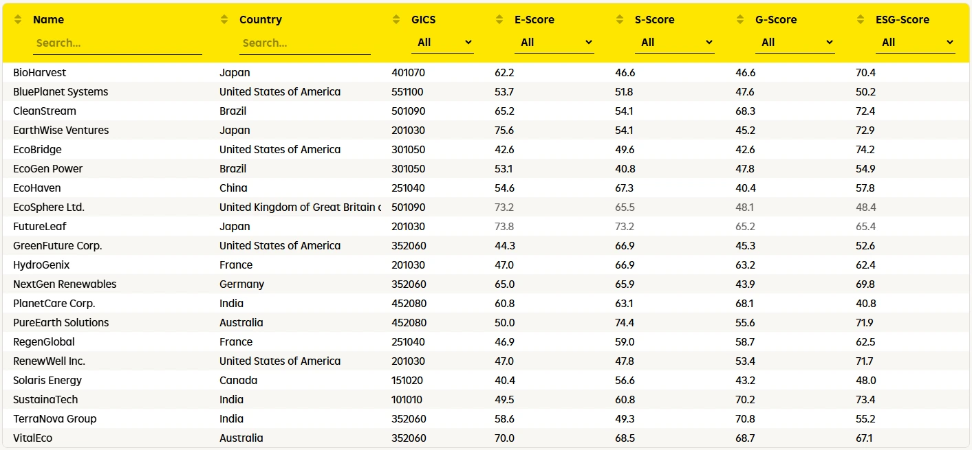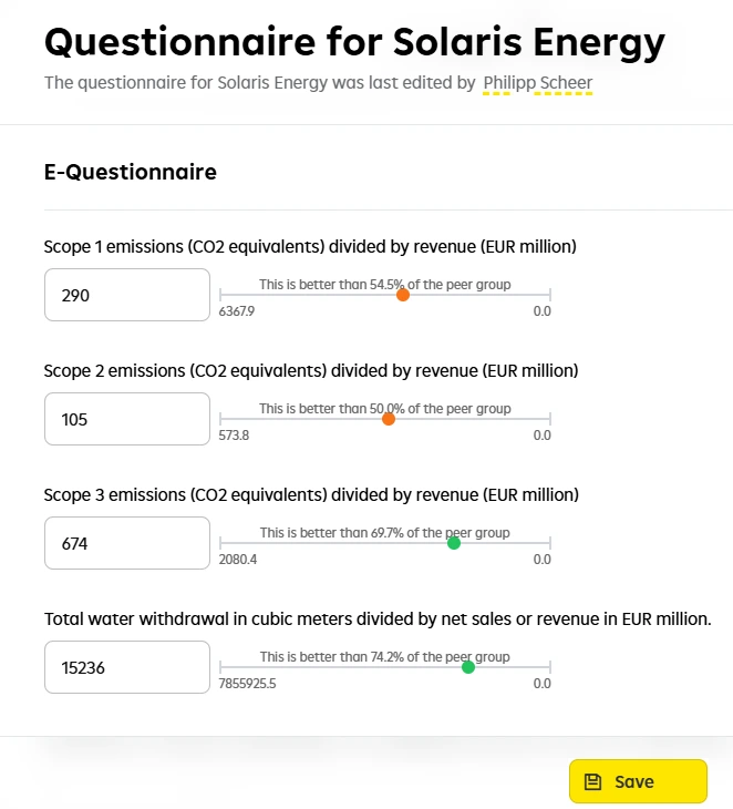 Use up to 300 data points to generate a comprehensive ESG score for over 13,000 companies — from large enterprises to SMEs. Our tool makes it possible to score non listed companies, using a simplified questionnaire, and benchmark them against your preferred peer group (GICS or country). Automatically flag controversies and view strengths and weaknesses in E, S, and G dimensions.